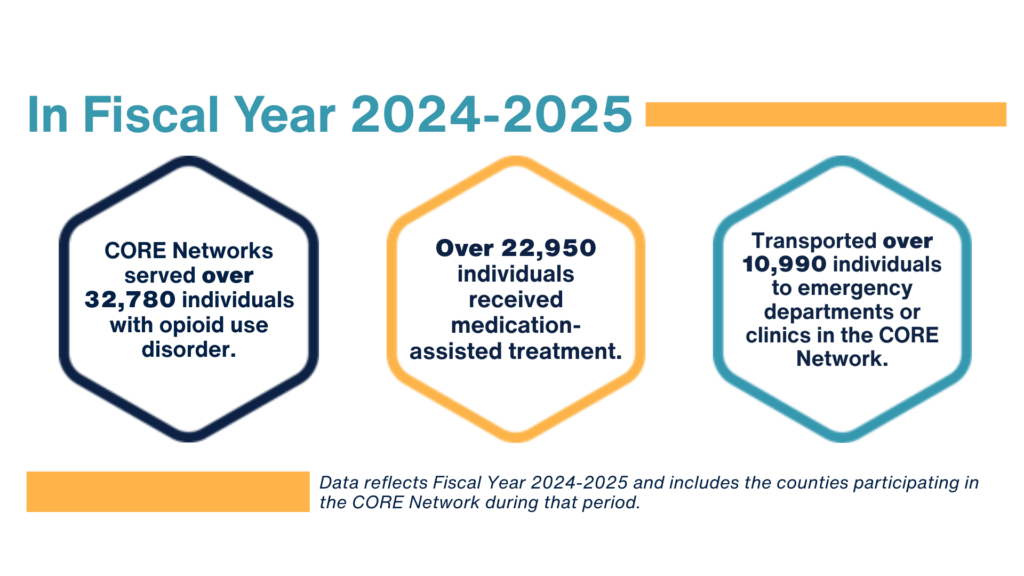 From embedding care coordinators and peer navigators directly in emergency departments, to linking individuals with long-term care and wraparound services, the CORE Network is designed to interrupt the cycle of individuals overdosing and returning to substance use.